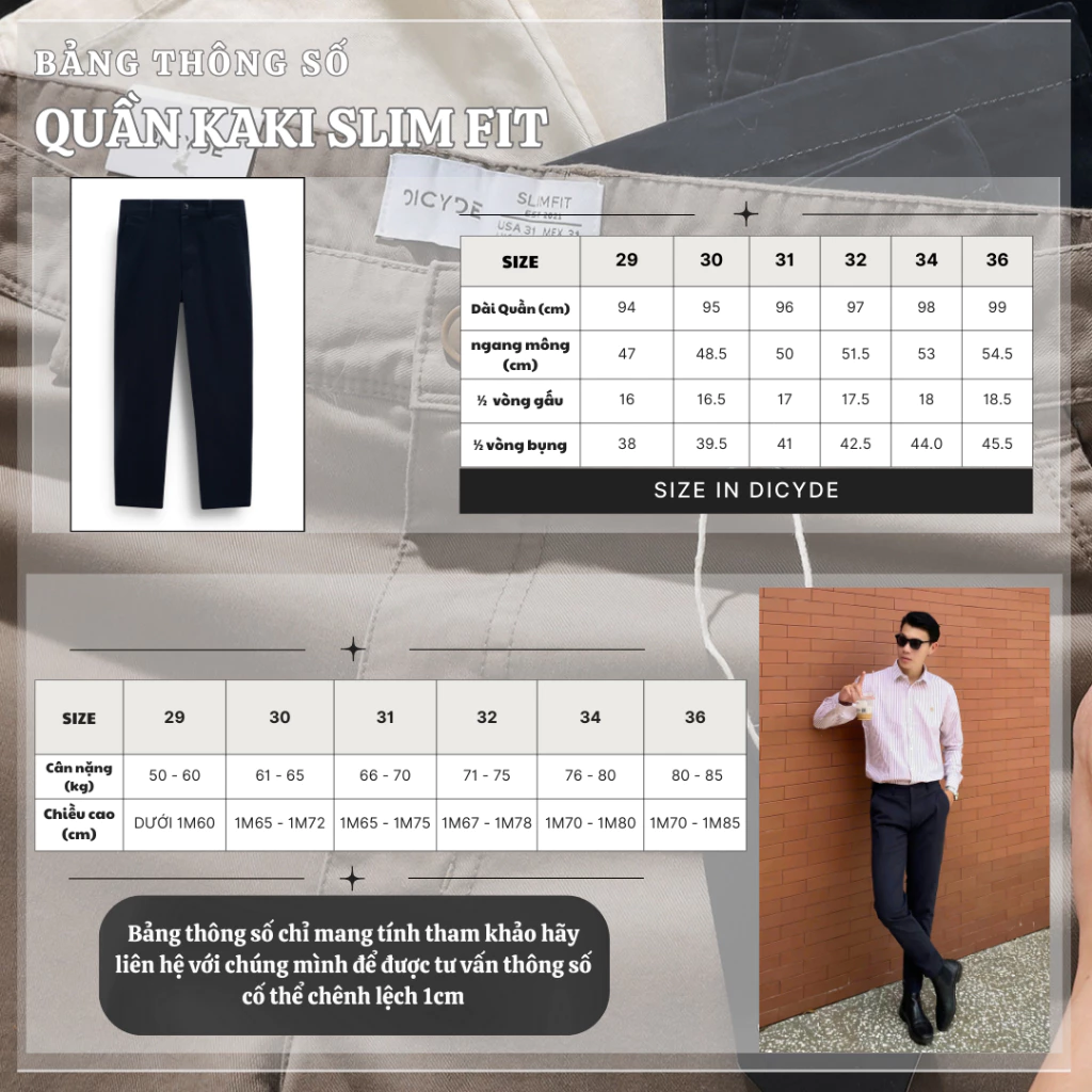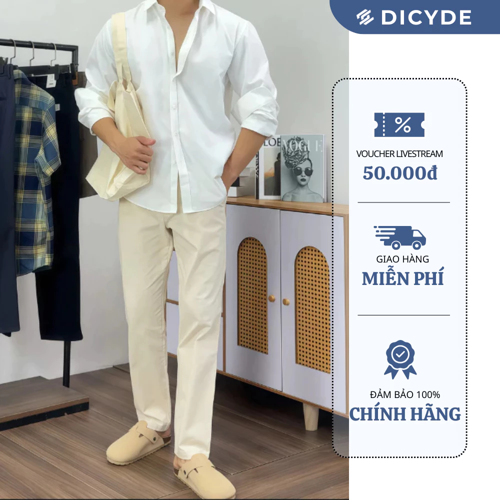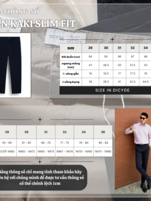 • Quần Kaki Nam DICYDE Slim Fit chất liệu Cotton cao cấp (97% Cotton – 3% Spandex), co giãn tốt, chống nhăn và bền màu.